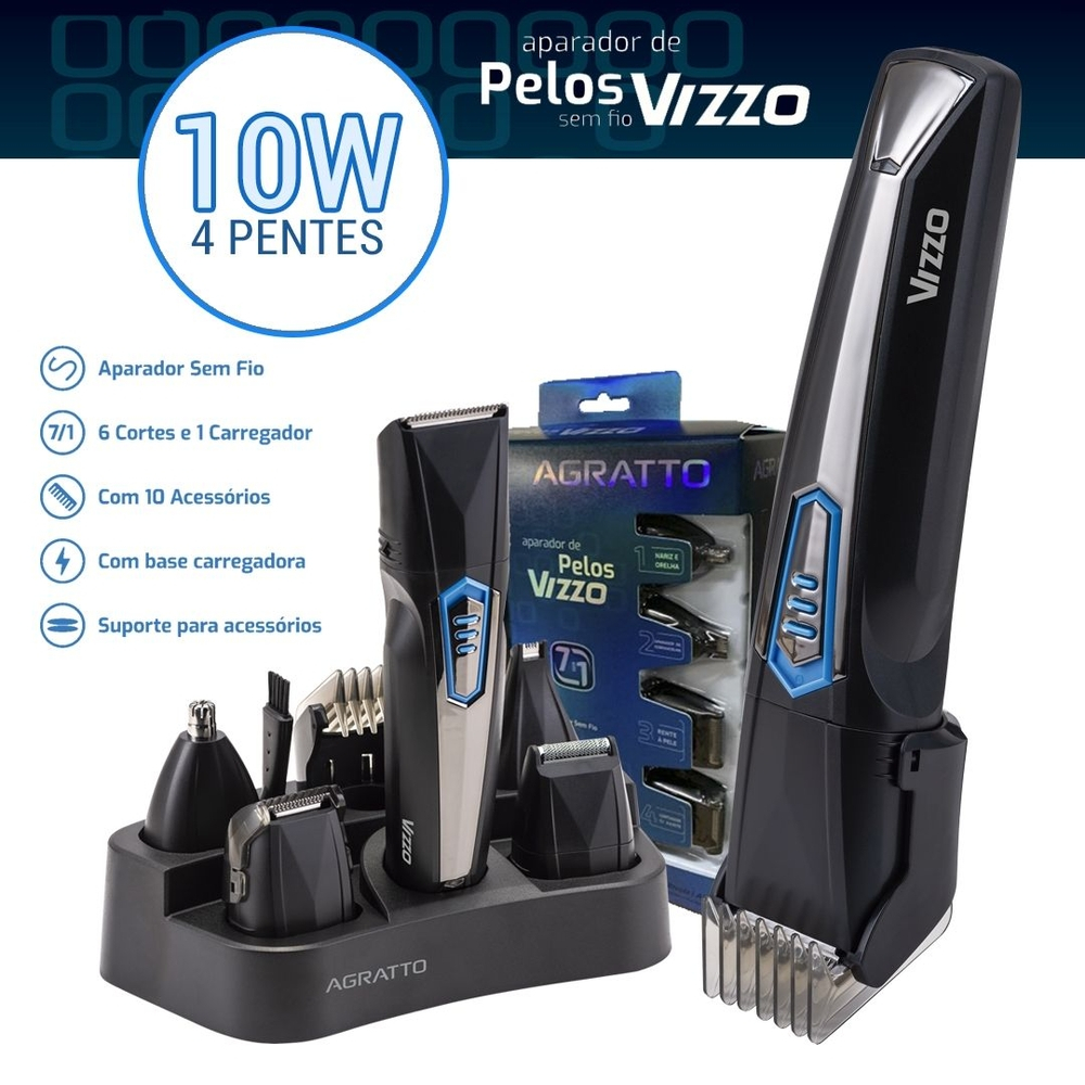 Aparador de Pelos Vizzo AP03 7 em 1, sem Fio, Bivolt, Agratto, com 6 Funções de Corte: 1º Aparador de sobrancelha; 2º Aparador para nariz e orelha; 3º Aparador rente à pele; 4º Aparador de pelos pequenos; 5º Aparador de pelos grandes; 6º Regulador de Corte. 10 Acessórios: 5 ponteiras de corte, 1 regulador de corte, 1 base carregadora, 1 carregador, 1 pente duplo e óleo lubrificante.