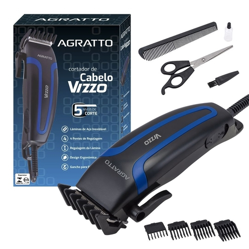 Cortador de Cabelos Vizzo, Côr Preto, 10 Watts, 127 Volts, da Agratto, leve e ergonômico, com lâminas em aço inoxidável com alta precisão de corte e maior durabilidade. Tem alavanca de regulagem de altura das lâminas com ajuste fácil e rápido. Com 4 regulagens. Acompanha: pente, tesoura, escovinha de limpeza e óleo lubrificante.