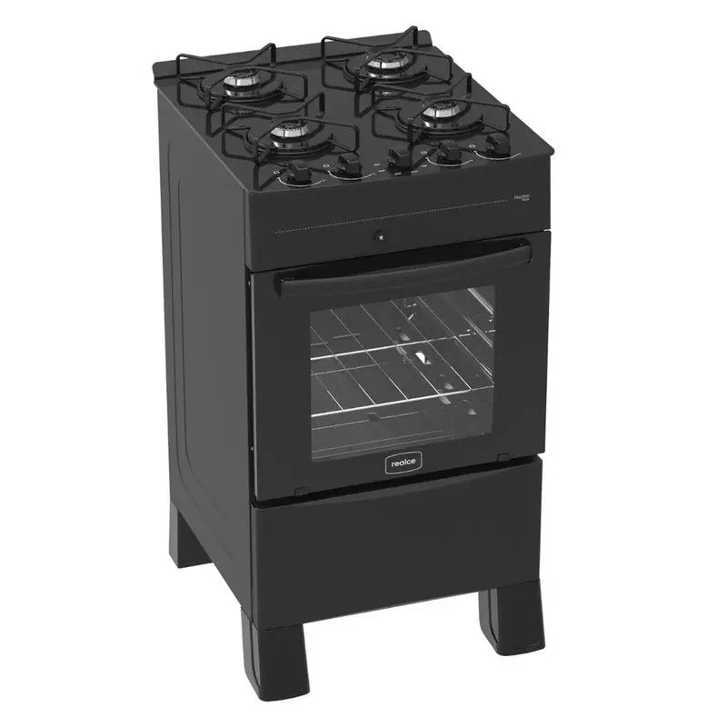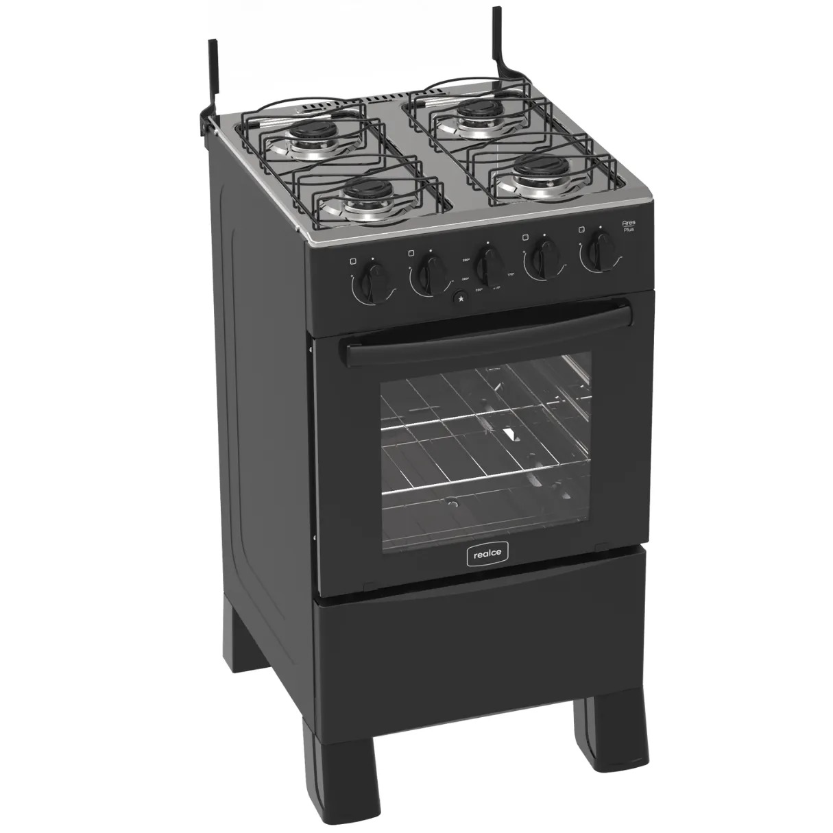 Fogão Ares Plus 4 Bocas, Côr Preto, da Realce Eletrodomésticos, Medidas: Alt 0,91m Larg 0,48m PROF 0,57M peso 18Kg – Mesa de Aço Inoxidável/Selada, Tampa de Vidro Temperado, Trempes Dupla/Arame de 4mm, com Novo Design e de Encaixe Exclusivo, Possibilita Melhor Estabilidade das Panelas, Queimadores Estampados Rápido e Semi Rápido, sendo 1 Queimador 1,8KW e 3 Queimadores 1,5KW de Potência – Forno: Alt 0,29m Larg 0,38m Prof 0,45m – Capacidade para 50L, com Porta Basculante com Vidro Temperado e Puxador, Grade Interna e Potência de 2,1Kw, Botões Reguladores Ergonômicos, Acendimento Automático, Sistema Cleartec que Facilita a Limpeza e Evita o Acúmulo de Gordura. Preparado para Gás Tipo GLP, podendo ser Convertido para Gás Encanado. Bivolt 110/220 Volts. Certificação de Eficiência Energética e de Segurança do Inmetro.