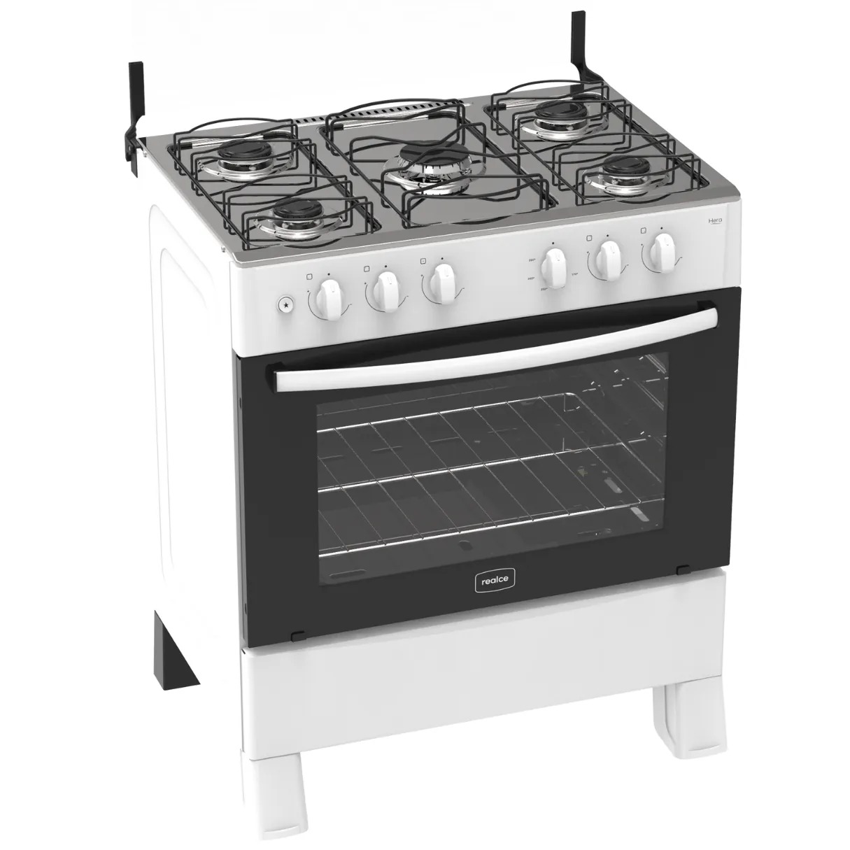 Fogão Hera Plus 5 Bocas, Côr Branco, da Realce Eletrodomesticos, Medidas: Alt 0,91m Larg 0,74m Prof 0,60m Peso 27Kg – Mesa de Aço Inoxidável/Selada, Tampa de Vidro Temperado. Trempes Encaixadas Duplas/Arame 4mm, com Novo Design e de Encaixe Exclusivo, que Possibilita Melhor Estabilidade das Panelas, Queimadores Estampados Rapidos e Semi Rápidos, sendo 2 Queimadores 1,8KW, 2 Queimadores 1,5KW e 1 Queimador 2,6KW – Forno: Alt 0,34m Larg 0,62m Prof 0,45m – Capacidade para 94L, com Porta Basculante com Vidro Temperado, Puxador, Grade Interna e Potência de 3,2KW, Botões Reguladores Ergonômicos, Acendimento Automático, Sistema Cleartec que Facilita a Limpesza e Acúmulo de Gordura, Preparado para Gás GLP, Podendo ser Convertido para Gás Encanado. Bivolt 110/220 Volts. Certificação de Eficiência Energética e de Segurança do Inmetro.