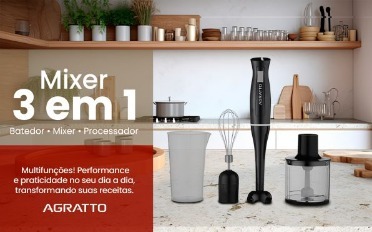 Mixer 3 em 1 AMIX01-01, Côr Preto, Capacidade: 700ml, Potência 200 Watts, Voltagem 127v, da Agratto. Multifunções para diversas Receitas. Design moderno e ergonômico, com Mixer 3 erm 1 você pode preparar vitaminas, molhos, processar alimentos como carnes e vegetasi, e bater massas leves e chantily. Poide ser usado diretamente na panela. Possui lâminas de aço inox e motor 200Watts. Multifunções 3 em 1 – Empunhadira Ergonômica, Botão de Acionamento, Corpo Desmontável – Lâminas de Aço Inoxidável – Protetor de Lâminas, Copo Medidor 700ml e Porcessador 500ml.