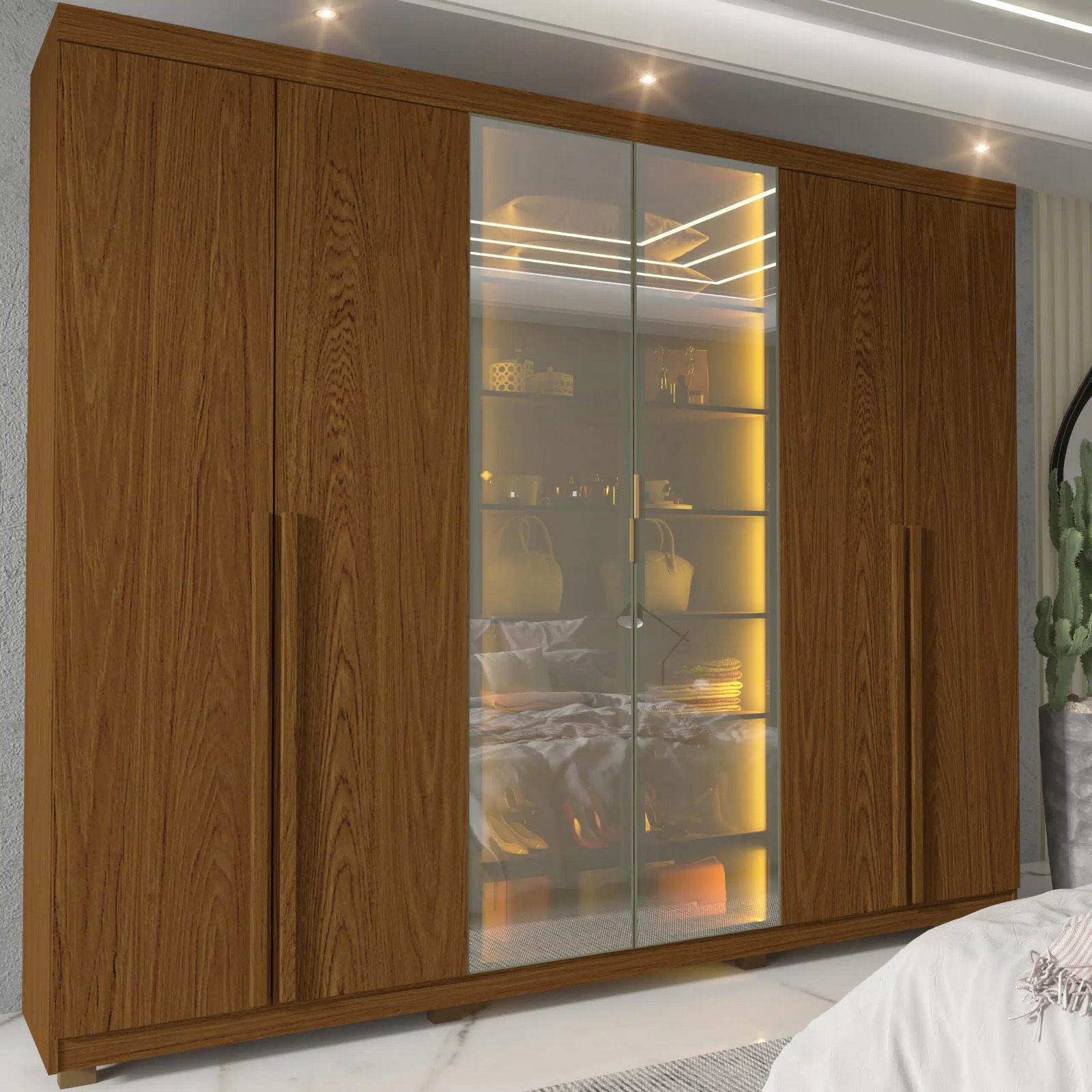 Roupeiro Imperatriz 6P sendo 2 Portas Vidro Reflecta com LED e Pes Castanho Gelius