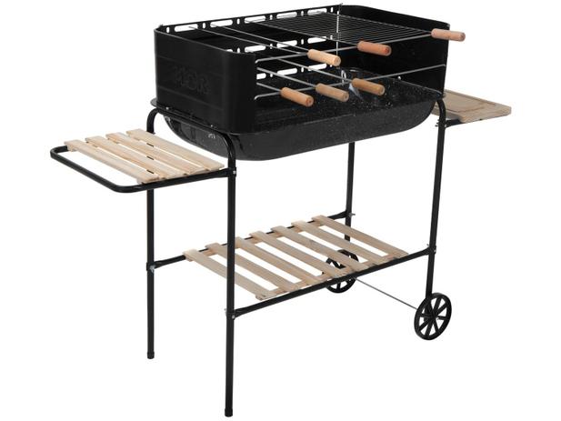 Alt 0,95m Larg 1,34m Prof 0,44m Peso 9,29Kg. Acompanha: 1 Grelha, 1 Tábua de Carne, 2 Grades para Utensílios, 3 Espetos Simples 58cm, 1 Espeto Duplo 58cm