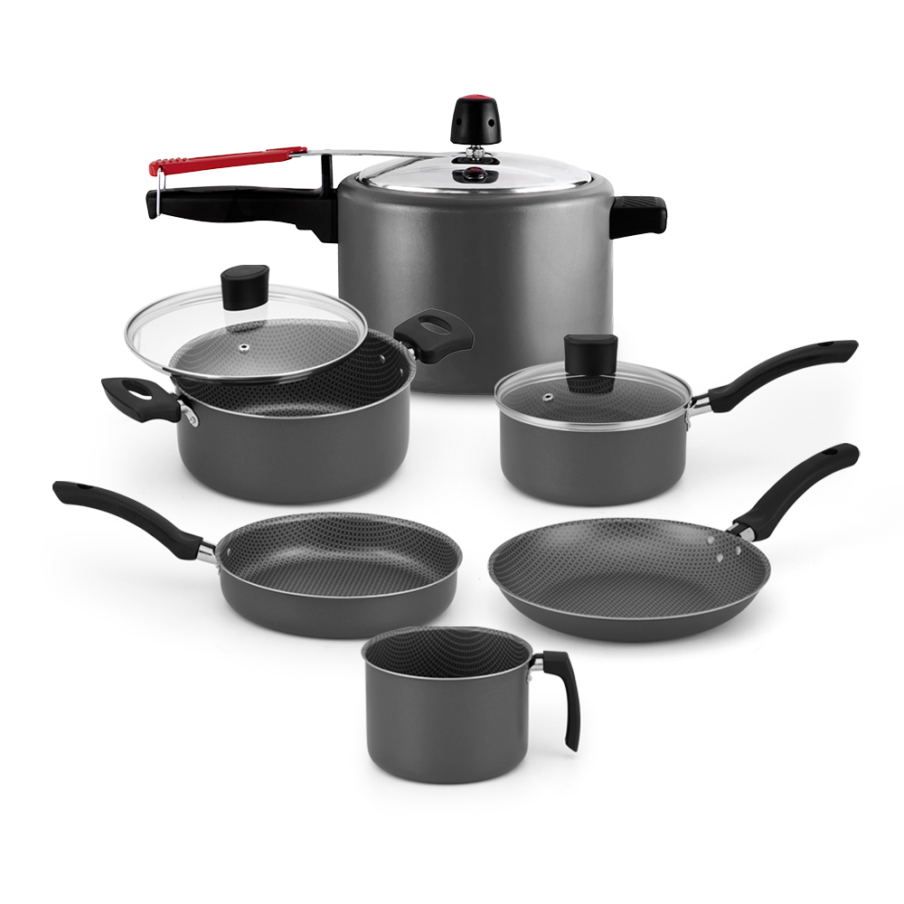 Conjunto de Panelas Enjoy 6 Peças com Panela de Pressão, Côr Cinza, da Alegrete, Composição do Conjunto: 1 Panela de Pressão 4,5L (Tampa de Alumínio Polido), 2 Caçarolas, 1 Frigideira Reta, 1 Frigideira Baixa e 1 Leiteira. Todas Produzidas com Lâmina de Alumínio, Revestimento Antiaderente Interno e Externo, Cabos, Alças e Pomel de Barquelite com Suporte Metálico.