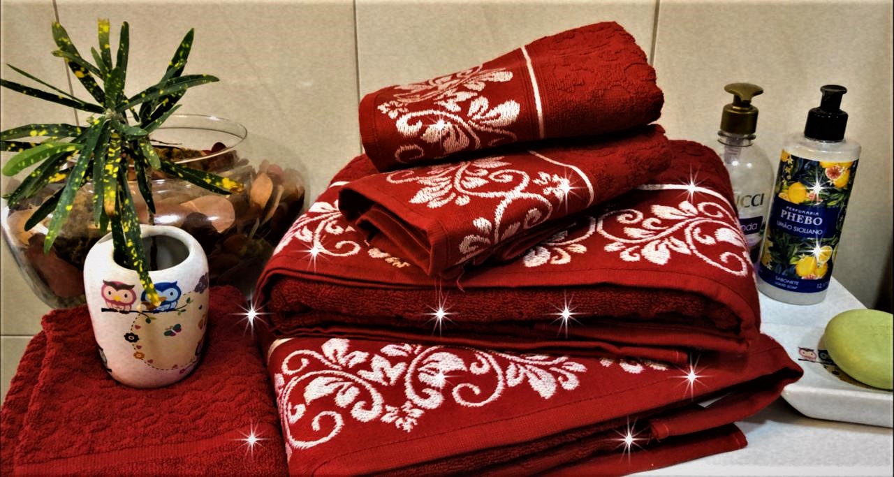 Jogo de Toalhas Jacquard Refinata 5 Peças, Côr Veludo Vinho 829, O fio 24/2 de 100% Algodão 470g/m2 (exceto efeito decorativo). 2 Toalhas de Banho 80cm x 1,50m, 2 Toalhas de Rosto 50cm x 80cm e 1 Piso 50cm x 70cm
